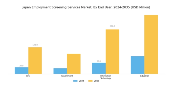 日本の雇用審査サービス市場は、金融、政府、情報技術、産業セクターなど、様々なエンドユーザーによって基本的に牽引されており、各セクターが市場動向において重要な役割を果たしています。雇用審査は、金融セクターにおいて厳格な規制へのコンプライアンスを確保し、金融詐欺に関連するリスクを軽減するため、不可欠な要素です。政府部門では、多様な部署における国家安全保障と雇用の健全性を維持するため、身元調査を重視しています。