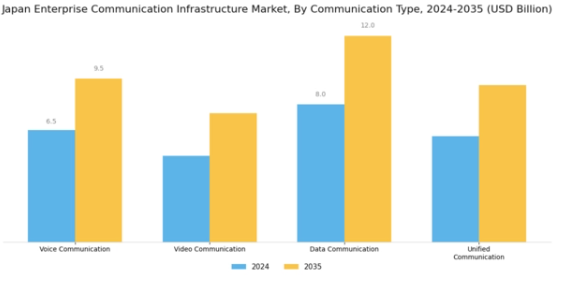 企業向け通信インフラ市場は、日本におけるリモートワークソリューションの需要増加に大きく影響を受けています。組織が柔軟な勤務形態に適応するにつれ、堅牢な通信インフラの必要性が極めて重要となっています。2025年までに、60%以上の企業がハイブリッドワークモデルを導入すると予測されており、信頼性の高いコミュニケーションツールが不可欠となります。この変化により、リモートチーム間の協業を促進するクラウドベースソリューションへの投資が促進されています。効果的なコミュニケーションチャネルを通じて従業員のエンゲージメントと生産性を向上させたい企業が増える中、この傾向は企業向け通信インフラ市場に好影響を与えるでしょう。リモートワークソリューションへの重点的な取り組みは、分散型労働力を支えるインフラを企業が優先するにつれ、市場成長を牽引すると予想されます。