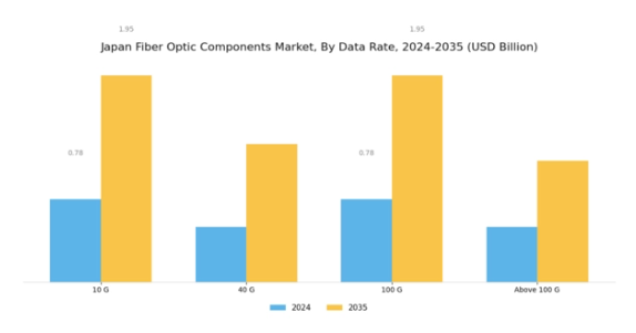 日本の光ファイバー部品市場におけるデータレートセグメントは、高速インターネットや先進的な通信サービスへの需要増加に伴い大きく進化している国内の接続環境全体において、極めて重要な役割を担っています。技術主導型の国である日本において、クラウドコンピューティング、モノのインターネット(IoT)、スマートシティ構想の普及により、光ファイバー部品市場は著しい成長を遂げています。