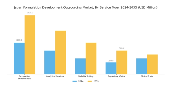 日本の製剤開発アウトソーシング市場は、研究開発活動への投資増加と効果的な薬剤製剤への需要高まりを背景に、サービス分野で著しい成長を遂げております。2024年に5億米ドルと評価された市場規模は、2035年までに12億米ドルに達すると予測されており、サービスセグメントはこの成長軌道を支える上で極めて重要な役割を担っています。このセグメントには、医薬品開発の成功を確実にするために不可欠な「プレ製剤サービス」や「製剤最適化」といった重要な領域が含まれます。