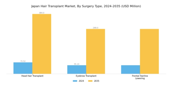 さらに、毛包分離技術(FIT)は、毛包採取の精度をさらに高め、移植結果を向上させると同時にドナー領域への負担を最小限に抑えるため、注目を集めています。技術の進歩に伴い、ロボットによる植毛術は外科的手法の分野において革新的な存在として台頭しています。ロボットシステムによる精度と再現性を活用したこの手法は、人為的ミスを減らし移植手術全体の効率を向上させる能力から、注目を集めています。毛髪移植市場 毛髪移植手術の種類に関する洞察日本の毛髪移植市場は、手術の種類に焦点を当て、毛髪再生ソリューションを求める個人に対応する多様な外科的選択肢を提供しています。頭部毛髪移植手術は、遺伝的要因やストレス増加などにより日本人人口に広く見られる脱毛や薄毛の問題に対処するため、最も需要の高い施術です。眉毛移植は、顔の審美性を高め、薄くなった眉を修正したい方々の間で人気を集めており、若年層における美容整形手術の増加傾向を反映しています。前頭部ヘアライン調整術も重要な施術の一つであり、ヘアラインをより好ましい位置に回復させることで若々しい印象を目指す方々に特に適しています。日本の植毛市場セグメンテーションでは、低侵襲技術への嗜好の高まり、技術の進歩、毛髪再生オプションに対する認知度の向上が顕著です。産業の課題としては、熟練した施術者の必要性や、高度な施術に伴う高額な費用が挙げられます。しかしながら、美容整形手術の受容度向上と手術手法の進歩に伴い、この市場セグメントにおける機会は堅調に推移しており、継続的な成長と革新への道筋が拓かれております。日本における植毛市場に関する詳細なインサイトを入手する無料サンプルをリクエスト主要企業と競争環境