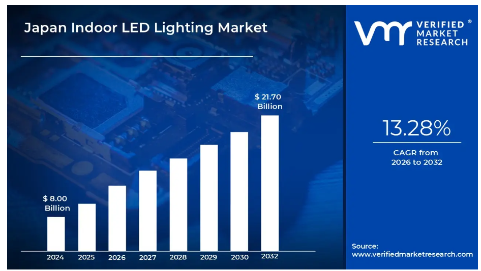 日本の屋内LED照明市場は、2024年に80億米ドルと評価され、2032年までに217億米ドルに達すると予測されております。また、2026年から2032年にかけて年平均成長率(CAGR)13.28%で成長する見込みです。