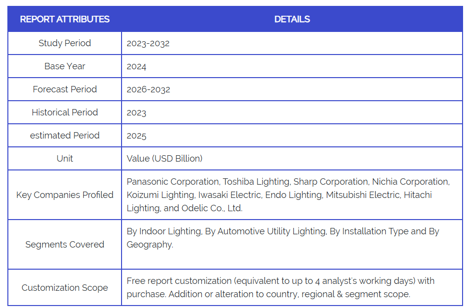 日本の屋内LED照明市場は、屋内照明、自動車用ユーティリティ照明、設置の種類、地域に基づいて分類されています。
