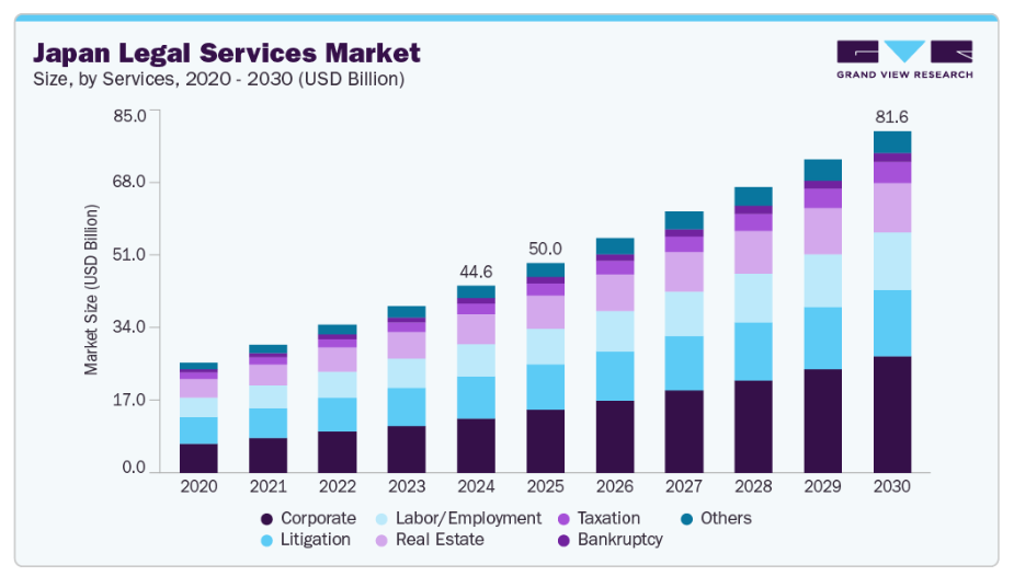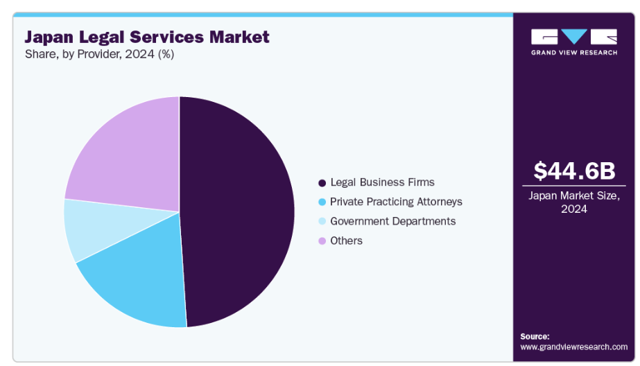 日本企業および日本国内で事業を展開する外国企業は、知的財産保護、データプライバシー、独占禁止法、労働法などの分野における専門的なサービスを求めます。経済改革と貿易・投資における日本の役割の拡大によって推進されるこの変化する環境は、複雑な法的環境をナビゲートするための高品質な法的助言への需要を継続的に増加させ、それによって日本の法務サービス産業を加速させています。