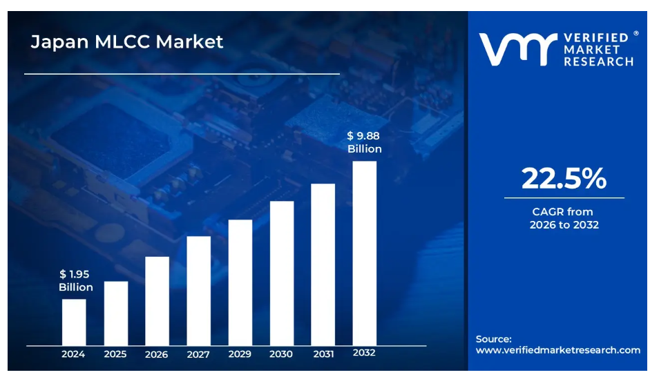 さらに、高容量MLCCの開発、材料科学の進歩、電気自動車(EV)や5GネットワークへのMLCCの組み込みといった技術的進歩が、市場の力学を再定義しています。革新的な電気部品への需要の高まりが、日本のMLCC市場を牽引しています。これにより、市場は2026年から2032年にかけて年平均成長率(CAGR)22.5%で成長することが可能となります。