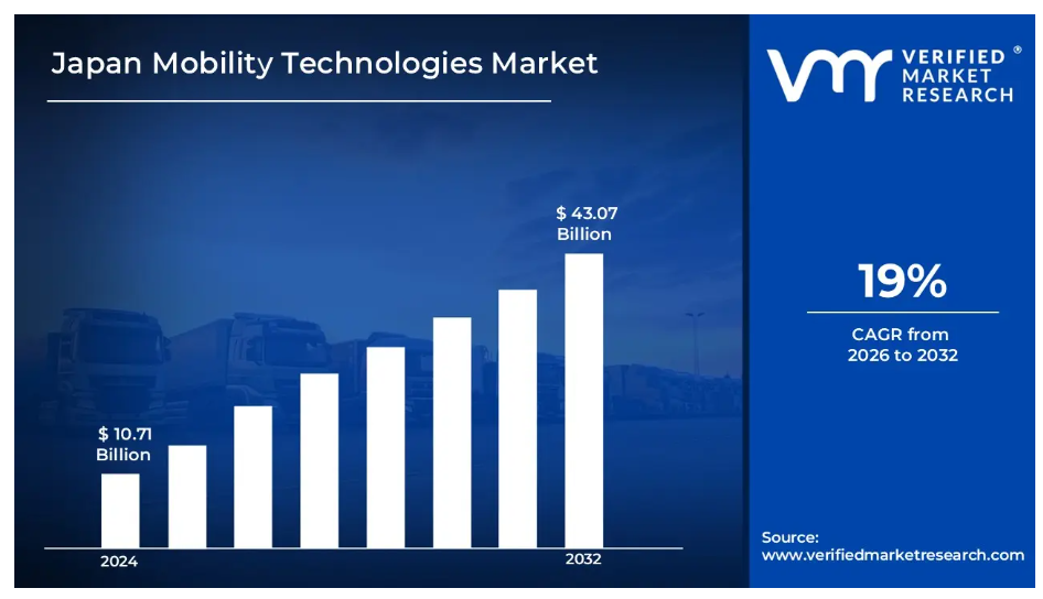 日本のモビリティ技術市場規模は、2024年に107億1,000万米ドルと評価され、2032年までに430億7,000万米ドルに達すると予測されています。これは、2026年から2032年までの予測期間において、年平均成長率(CAGR)19%で成長することを示しています。