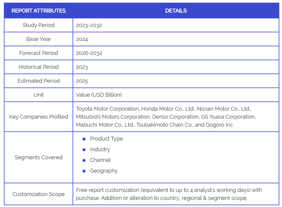 「日本モビリティ技術市場」調査レポートは、グローバル市場に重点を置いた貴重な知見を提供します。市場の主要企業は以下の通りです:トヨタ自動車株式会社、本田技研工業株式会社、日産自動車株式会社、三菱自動車工業株式会社、株式会社デンソー、GSユアサ株式会社、マブチモーター株式会社、椿本チエイン株式会社、ゴーゴーロ株式会社