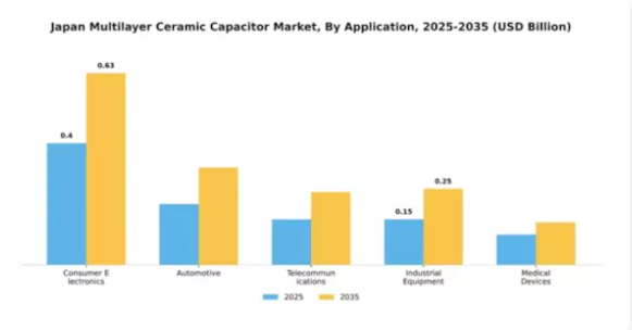 自動車分野における電子機器の統合が進むことで、日本多層セラミックコンデンサ市場は成長が見込まれています。自動車産業が電気自動車(EV)や先進運転支援システム(ADAS)へ移行する中、信頼性が高くコンパクトなコンデンサの需要が高まっています。2025年時点で、日本の自動車電子機器市場規模は約300億米ドルと推定されており、多層セラミックコンデンサは様々な電子システムの性能向上に重要な役割を果たしています。車両の電動化・自動化の流れは、電力管理や信号処理に不可欠な高品質コンデンサの使用を必要とします。この変化により、多層セラミックコンデンサ技術へのさらなる投資が促進され、市場拡大が見込まれます。