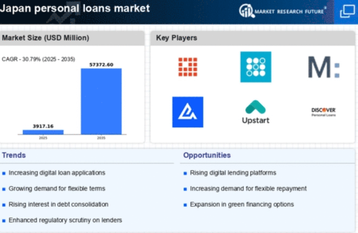 日本の個人ローン市場は、経済回復の局面の恩恵を受けており、これが消費者信頼感の高まりを促進しているようです。経済が安定するにつれ、個人は個人的なプロジェクトや投資のために負債を負う傾向が強まっています。最近の統計によると、消費者信頼感指数は過去1年間で約15%上昇し、それに伴いローン申込件数も増加しています。この新たな楽観論は、消費者が自身の財務状況に安心感を抱くようになるにつれ、個人ローン市場の成長を促進する可能性が高いです。加えて、有利な金利と競争力のある融資オプションが、借り手にとって個人ローンを現実的な金融ソリューションとして検討する動機となっています。経済状況と消費者心理の相互作用は、個人ローン市場の動向を形成する上で極めて重要です。