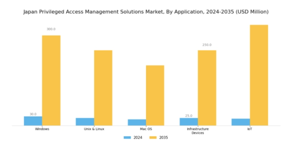 日本の特権アクセス管理ソリューション市場は、堅牢なセキュリティインフラに不可欠な多様なアプリケーションを特徴としています。様々なオペレーティングシステムに焦点を当てると、Windowsプラットフォームは企業環境での広範な利用により主要な領域を占め、強化されたアクセス管理ソリューションの需要を牽引しています。UnixおよびLinuxアプリケーションも、特に機密データとシステム完全性の管理が重要な技術や金融などの分野において重要です。Mac OSセグメントは、知的財産を保護するための独自のアクセシビリティ機能に依存するクリエイティブおよびデザイン分野において重要性を増しています。