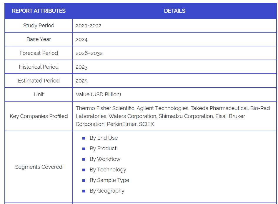 - 主要企業: Thermo Fisher Scientific, Agilent Technologies, Takeda Pharmaceutical, Bio-Rad Laboratories, Waters Corporation, Shimadzu Corporation, Eisai, Bruker Corporation, PerkinElmer, SCIEX