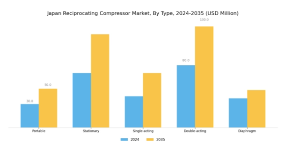 日本の往復動式コンプレッサー市場は様々な種類を含み、それぞれが産業全体の動向に独自に貢献しています。種類別セグメントには、ポータブル、固定式、単動式、複動式、ダイヤフラムコンプレッサーなどの分類が含まれます。ポータブルコンプレッサーは移動性に優れ、建設現場、メンテナンス作業、屋外用途などで頻繁に利用され、様々な環境下でのニーズに迅速に対応できる点が評価されています。この特性は、インフラ開発や緊急メンテナンス作業が頻繁に行われる日本において特に重要です。