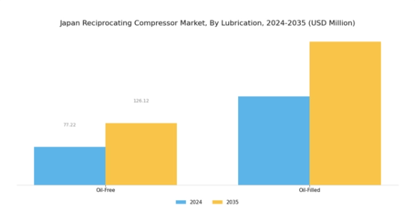 日本の往復動式コンプレッサー市場では、潤滑方式が重要なセグメントを形成しており、様々な用途におけるコンプレッサーの効率と性能に大きく影響します。このセグメントは主にオイルフリー方式とオイル充填方式の2つに分類されます。オイルフリーコンプレッサーは、製薬や食品加工など、純度と汚染管理が最優先される分野で特に注目を集めています。オイルの混入を排除する能力により圧縮空気の品質が向上するため、厳しい業界基準を満たす上で不可欠です。