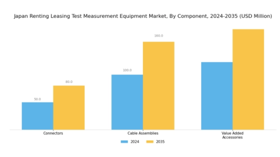 日本のレンタル・リース試験測定機器市場における構成要素セグメントは、コネクタ、ケーブルアセンブリ、付加価値アクセサリーなどの重要な要素を含み、それぞれが測定精度と運用効率の向上に重要な役割を果たしています。コネクタは、様々な測定機器間の信頼性の高い接続を確立するために不可欠であり、これにより試験プロセス中のデータ完全性が確保されます。