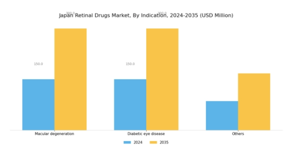 日本における高齢化は、網膜治療薬市場にとって重要な推進要因です。加齢に伴い、加齢黄斑変性(AMD)や糖尿病性網膜症といった加齢関連眼疾患の罹患率は上昇する傾向にあります。最近の統計によれば、日本の65歳以上の約30%が何らかの視覚障害を抱えています。この人口動態の変化により、効果的な網膜治療への需要が高まり、網膜薬市場の成長を促進する可能性があります。さらに、日本政府は高齢者向け医療サービスの強化の必要性を認識しており、この分野の研究開発に対する資金援助や支援の増加につながる可能性があります。したがって、高齢化と支援的な医療政策の組み合わせが、日本の網膜薬市場に大きな影響を与える可能性があります。