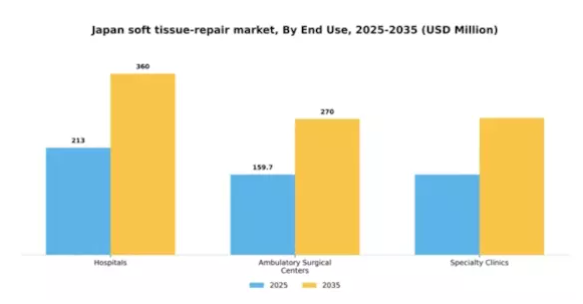 日本の軟部組織修復市場において、病院は最終用途セグメントの中で最大のシェアを占め、サービスへのアクセス性と患者治療の重要な部分を担っています。外来手術センターは競争力のある代替手段として台頭しており、費用対効果の高いソリューションと外来手術の利便性を通じて、徐々に市場シェアを拡大しています。このセグメントの成長傾向は、低侵襲手術処置と外来サービスの需要増加に影響を受けています。回復期間の短縮と患者体験の向上への注力が、外来手術センターの拡大を推進しています。さらに、手術技術と材料の継続的な進歩により、これらの施設はより複雑な処置に対応できるようになり、市場で最も成長が速いセグメントとしての地位を強化しています。
