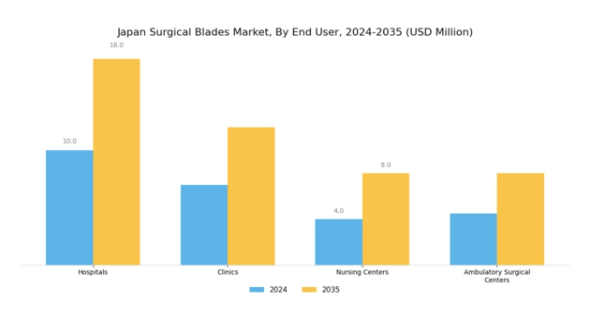 日本の外科用ブレード市場は、病院、診療所、介護施設、外来手術センターなど、多様かつ重要なエンドユーザーセグメントによって主に特徴づけられています。病院は主要なセグメントを占めており、広範な外科手術と低侵襲手術への注目の高まりにより、様々な外科用ブレードに対する需要が高まっています。診療所は外来手術全般に対応しており、刃の性能における効率性と精度が極めて重要であるため、市場の成長に大きく寄与しています。