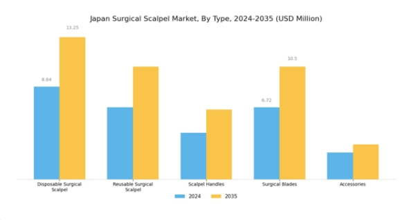 日本における外科的精度の重視は、外科用メス市場の主要な推進要因です。外科医は、手術中の精度を高め、組織損傷を最小限に抑える器具をますます求めています。この精度への重点は、特に低侵襲手術において重要であり、先進的なメスの使用は患者の回復期間や治療結果に大きく影響します。2025年には、メスを含む精密外科用器具市場は約5%の成長が見込まれており、高性能な外科用器具への需要増加を反映しています。メーカーはこの傾向に対応し、人間工学的設計の改善や精密な切開を可能にする先端素材を用いたメスの開発を進めています。医療分野が患者の安全性と手術の有効性を引き続き最優先事項とする中、外科的処置における精密性のニーズに応える革新技術に牽引され、外科用メス市場は成長を続ける見込みです。