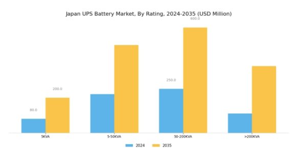 日本のUPSバッテリー市場は、多様な産業ニーズに対応する様々な定格を特徴とする強固な枠組みを示しています。このセグメンテーションは、日本が技術インフラの強化を続ける中、通信、医療、ITなどの重要分野における無停電電源供給を確保する上で極めて重要な役割を果たしています。セグメントの中では、5KVA定格システムは、電子機器のバックアップ電源が不可欠な中小企業や家庭用分野で一般的に利用されています。5~50KVAの範囲は中規模企業向けであり、大規模な投資を伴わずに高い電力需要に対応します。50~200KVAの定格システムはより大規模な施設向けに設計され、重要な産業・商業用途における業務継続性を支えます。