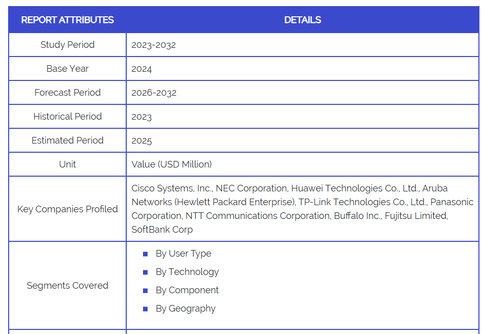 「日本Wi-Fi市場」調査レポートは、グローバル市場に焦点を当てた貴重な知見を提供します。市場における主要企業は以下の通りです:Cisco Systems, Inc., NEC Corporation, Huawei Technologies Co., Ltd., Aruba Networks (Hewlett Packard Enterprise), TP-Link Technologies Co., Ltd., Panasonic Corporation, NTT Communications Corporation, Buffalo Inc., Fujitsu Limited, And SoftBank Corp.