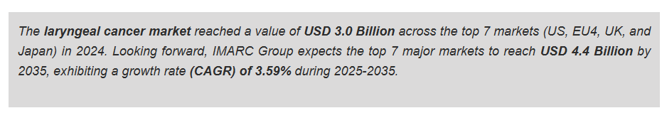 喉頭癌市場は、2024年に主要7市場(アメリカ、EU4、英国、日本)において30億ドルの規模に達しました。