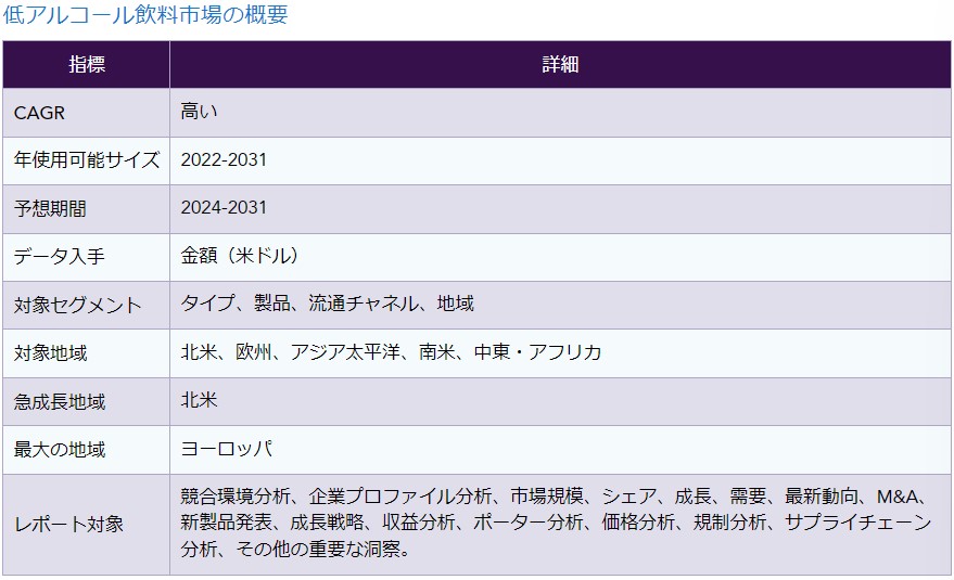 世界の低アルコール飲料市場は、予測期間中(2024-2031年)に高いCAGRで成長すると予測されている。