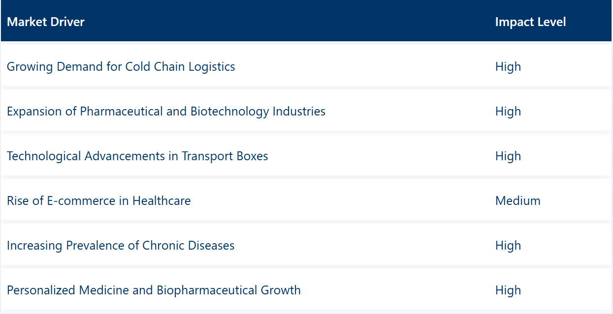 慢性疾患の発生率の増加:心血管疾患、糖尿病、がんなどの慢性疾患の有病率の増加により、医薬品や医療用品の需要が高まり、安全な輸送ソリューションの必要性が高まっています。サプライチェーンの混乱と物流の問題:地政学的緊張、輸送の遅延、原材料価格の変動は、医療輸送用ボックスの供給と価格に影響を与え、業界の成長を妨げる要因となる可能性があります。