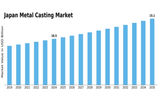 日本の金属鋳造市場は、2024年の105億米ドルから2035年までに151億米ドルへ成長すると予測されている。