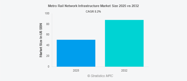 Stratistics MRCによると、世界の地下鉄鉄道ネットワークインフラ市場は2025年に506億9000万ドルを占め、予測期間中の年平均成長率は8.2%で、2032年には880億1000万ドルに達する見込みです。都市鉄道輸送は、地下鉄網インフラとして知られる技術的・物理的コンポーネントの統合システムによって支えられています。鉄道線路、駅、電力供給、信号システム、制御センター、車両基地、通信ネットワークなどがその一部です。このインフラは、大都市圏内での大容量の高速輸送を可能にすることで、効果的で信頼性が高く、環境に配慮した都市モビリティを促進します。拡大する都市では、交通渋滞を緩和し、公共交通機関へのアクセスを改善するために不可欠です。