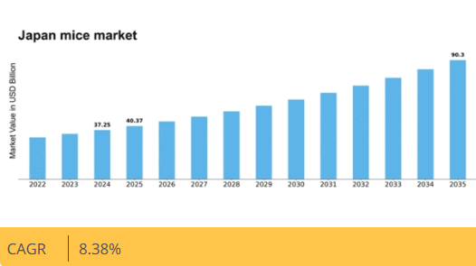 マーケットリサーチフューチャーの分析によると、2024年の日本のマウス市場規模は372億5000万米ドルと推定された。マウス市場は、2025年の403.8億米ドルから2035年までに903億米ドルへ成長し、予測期間(2025年~2035年)において年平均成長率(CAGR)8.3%を示すと予測されている。