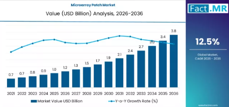 世界のマイクロアレイパッチ市場は、2026年に11億7,000万米ドルに達し、2036年までに38億1,000万米ドルへと拡大し、年平均成長率12.5%という堅調な成長を遂げると予測されています。この高い成長軌道は、根本的に溶解型マイクロニードルパッチの明確なセグメント優位性によって決定づけられており、その使いやすさと廃棄物の発生がない設計により、50.4%のシェアを占めています。