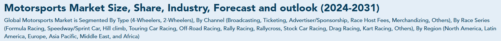 世界のモータースポーツ市場は、種類別、チャンネル別、レースシリーズ別、用途別、地域別に区分されています。