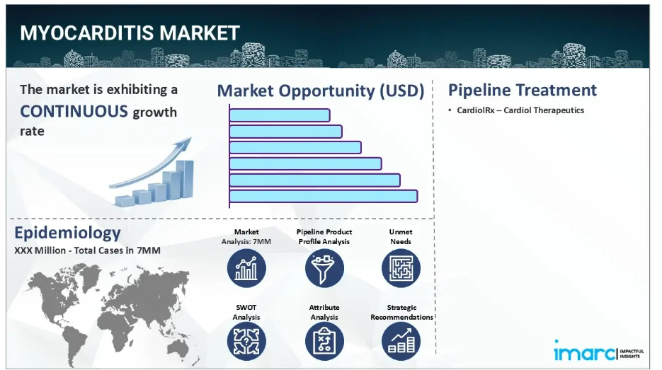 IMARC Groupの新報告書は、米国、EU4(ドイツ、スペイン、イタリア、フランス)、英国、日本における心筋炎市場について包括的な分析を提供しております。これには、治療実践、市場流通中および開発中の薬剤、個別療法のシェア、主要7市場における市場動向、主要企業とその薬剤の市場実績などが含まれます。また、主要7市場における現在および将来の患者数についても記載されております。本報告書によれば、米国は心筋炎患者数が最も多く、治療市場としても最大規模を占めています。さらに、現行の治療実践/アルゴリズム、市場推進要因、課題、機会、償還状況、未充足医療ニーズなども記載されています。本レポートは、メーカー、投資家、ビジネス戦略家、研究者、コンサルタント、および心筋炎市場に関与している、あるいは参入を計画している全ての方にとって必読の資料です。
