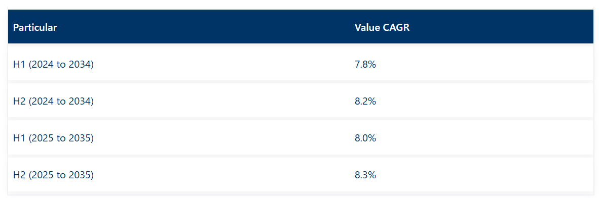 2025年から2035年までの半期ごとの世界産業予測CAGRは、上記の表に示されております。2024年度上半期(H1)には7.8%のCAGRで成長し、同年下半期(H2)にはやや加速して8.2%の成長が見込まれております。2025年前半期にはCAGRが8%にやや低下すると予測されますが、後半期には8.3%で成長を継続します。産業は前半期(H1 2025)に35ベーシスポイントの低下、後半期(H2 2025)に46ベーシスポイントの上昇を記録しました。