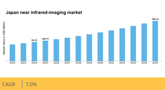 日本の近赤外線イメージング市場は、技術進歩と医療分野での応用拡大を背景に、2024年から2035年にかけて年平均成長率(CAGR)7.0%で成長すると予測される。