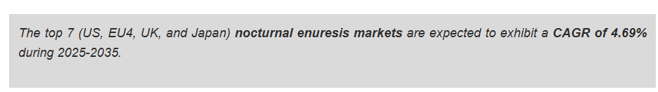 主要7市場(アメリカ、EU4、英国、日本)における夜尿症市場は、2025年から2035年にかけて年平均成長率(CAGR)4.69%を示すと予測されております。