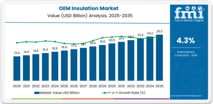 世界のOEM断熱材市場は、2035年までに253億米ドルに達すると予測されており、予測期間中に87億米ドルの絶対増加を記録する見込みです。2025年の市場規模は166億米ドルと評価され、予測期間中に年平均成長率(CAGR)4.3%で成長すると予測されています。世界的な省エネ型HVACシステム・家電製品の需要増加、自動車音響・熱管理要件の高まりによる軽量断熱材需要の拡大、電気自動車プラットフォーム・産業設備のアップグレード・高性能冷凍システムへの世界的な投資増加を背景に、同期間中の市場規模は約1.5倍に成長すると見込まれる。