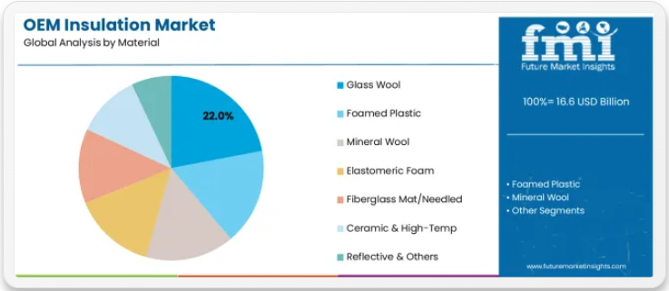 自動車用途は2025年に約26.0%の市場シェアでOEM断熱材市場を支配しており、バッテリーパック保護における断熱バリア、キャビン騒音低減における防音ブランケット、排気系・アンダーボディシステムにおけるヒートシールドが、車両の快適性・安全性・効率性を支える重要な役割を反映している。自動車セグメントの市場リーダーシップは、特殊なバッテリー熱管理を必要とする電気自動車プラットフォームの拡大、低密度断熱材の採用を推進する軽量化イニシアチブ、および静粛性を高める電気パワートレインにおける吸音性強化を求める音響要件によって支えられている。