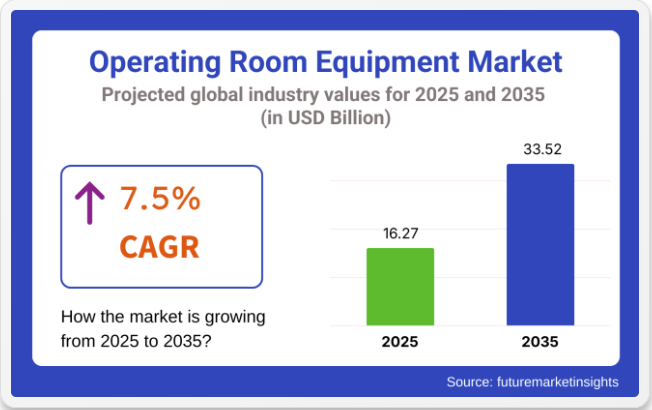 世界の手術室機器市場は、2025年に162億7000万米ドルと推定され、2035年までに335億2000万米ドルに達すると予測されており、予測期間中の年平均成長率(CAGR)は7.5%を記録する見込みです。世界的な手術件数の増加、低侵襲手術およびロボット支援手術の普及拡大、手術室の継続的な近代化を背景に、市場は力強い成長過程を遂げている。