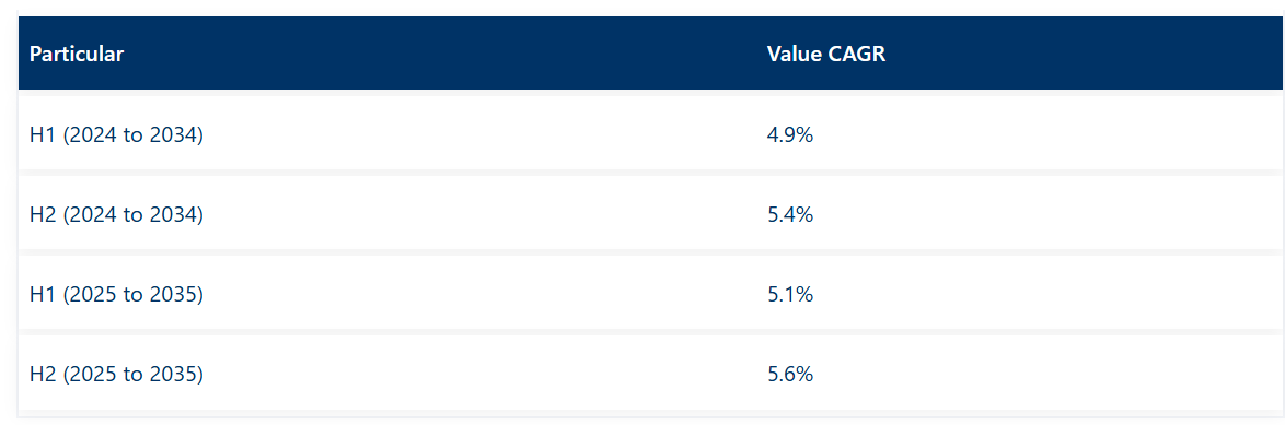 2024年から2034年までの10年間の前半期(H1)において、市場は4.9%のCAGRで拡大すると予測され、後半期(H2)ではより高い成長率である5.4%が続くと見込まれます。2025年から2035年にかけては、前半期(H1)のCAGRが5.1%に上昇し、後半期(H2)では5.6%で安定すると予測されます。前半期(H1)では20ベーシスポイント(BPS)の増加を記録したのに対し、後半期(H2)では成長率がわずかに20ベーシスポイント(BPS)上昇しました。