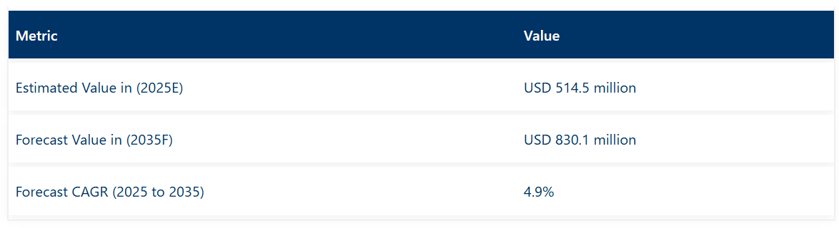 世界のシュウ酸市場は、2025年に5億1450万米ドルと評価され、2035年までに8億3010万米ドルに達すると予測されており、予測期間中に3億1560万米ドルの絶対的な増加を記録する見込みです。