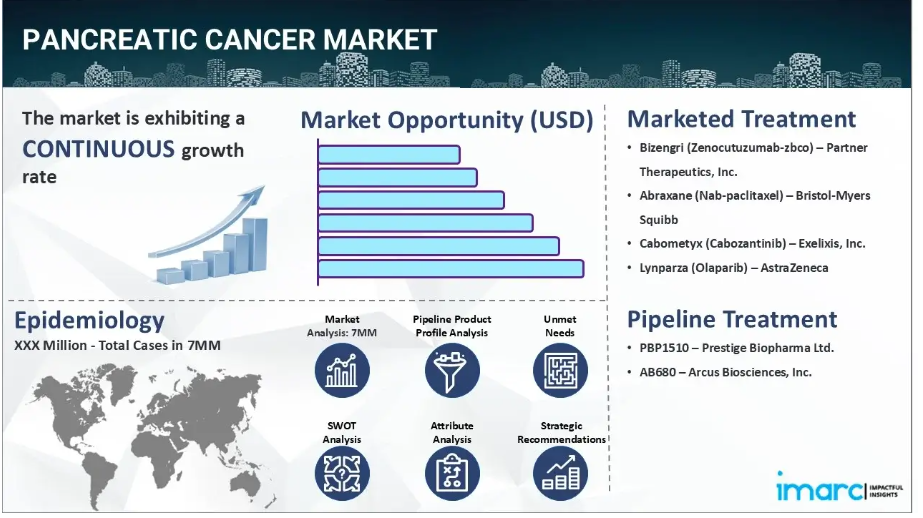 IMARC Groupの新報告書は、米国、EU4(ドイツ、スペイン、イタリア、フランス)、英国、日本における膵臓癌市場について包括的な分析を提供しております。これには、治療実践、市場流通中および開発中の薬剤、個別療法のシェア、主要7市場における市場動向、主要企業とその薬剤の市場実績などが含まれます。また、主要7市場における現在および将来の患者数についても記載されております。本報告書によれば、米国は膵臓癌患者数が最も多く、治療市場規模も最大となっています。さらに、現在の治療実践/アルゴリズム、市場推進要因、課題、機会、償還シナリオ、未充足医療ニーズなども本報告書に記載されています。本報告書は、メーカー、投資家、ビジネス戦略家、研究者、コンサルタント、および膵臓癌市場に関与している、あるいは参入を計画している全ての方にとって必読の資料です。