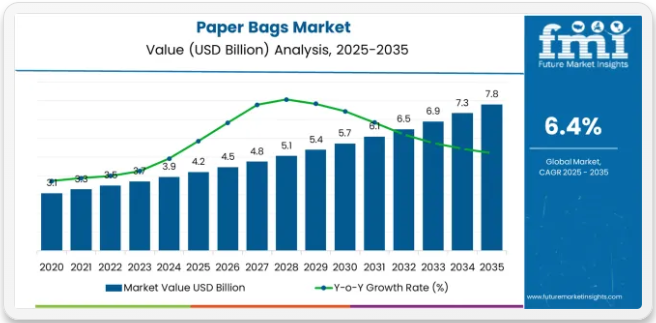 紙袋市場は、包装ソリューションと小売流通技術を変革する10年にわたる拡大軌道への入り口に立っている。2025年の42億米ドルから2035年までに78億米ドルへ成長する市場動向は、小売業務、外食産業、ECフルフィルメント分野における環境に優しい包装材と再生可能な袋ソリューションの採用加速を示す大幅な成長過程を物語っている。
