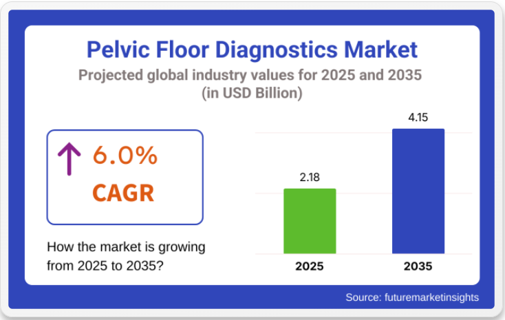 世界の骨盤底診断市場は、2025年に21億8,000万米ドルと推定され、2035年までに41億5,000万米ドルに達すると予測されており、予測期間中の年平均成長率(CAGR)は6.0%を記録する見込みです。骨盤底診断市場は、高齢化人口や産後女性における骨盤底障害(PFD)の早期発見への注目が高まる中、持続的な成長を遂げている。