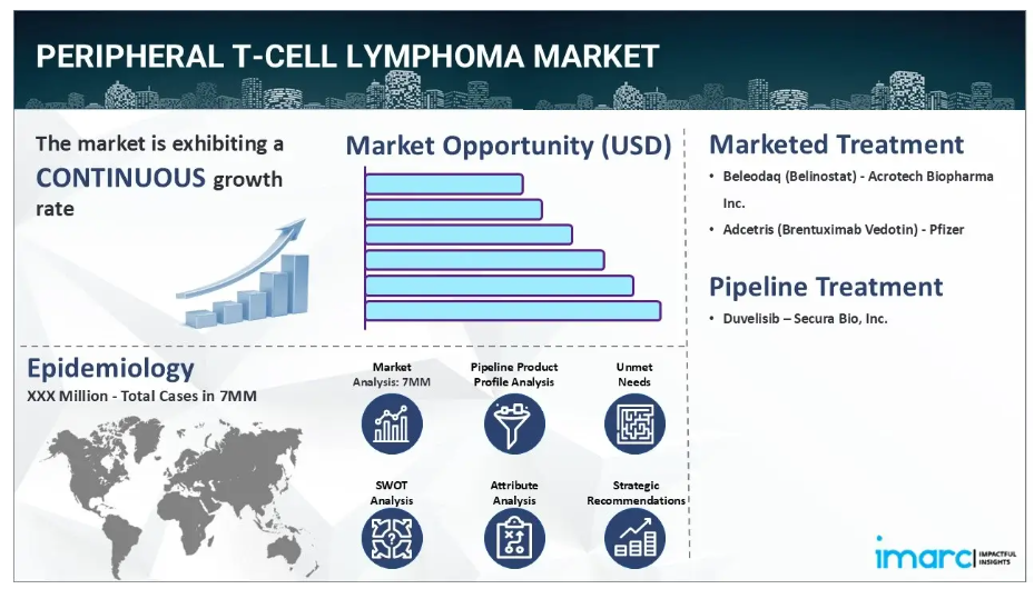 IMARC社の新報告書「末梢性T細胞リンパ腫市場規模、疫学、市場内医薬品売上高、開発中の治療法、および地域別展望 2025-2035年」において、末梢性T細胞リンパ腫市場が包括的に分析されました。末梢性T細胞リンパ腫は、成熟したT細胞またはナチュラルキラー細胞に由来する非ホジキンリンパ腫の種類です。本疾患に伴う一般的な症状には、リンパ節の腫脹、発熱、寝汗、原因不明の体重減少、疲労感、皮膚の発疹や病変などが挙げられます。一部の患者様には、全身性の症状として、全身のかゆみ、骨の痛み、腹部不快感などが現れる場合があります。また、複数の臓器やシステムに影響を及ぼす可能性があるため、呼吸困難、消化器系の障害、神経学的症状など、臓器関与に関連する症状が現れることもあります。末梢性T細胞リンパ腫の診断には、臨床検査、画像検査、病理学的分析からなる包括的な評価が必要です。通常、リンパ節の状態を評価する身体検査から始まり、疾患の広がりを評価するためにコンピュータ断層撮影(CT)や陽電子放射断層撮影(PET)などの画像検査が行われます。病変リンパ節やその他の関与組織の生検は、組織病理学的分析と免疫表現型解析を通じて診断を確定し、特定の亜型を特定するために不可欠です。さらに、疾患に関連する遺伝的異常やウイルス感染を特定するため、分子・遺伝子検査を含む様々な追加検査も行われます。