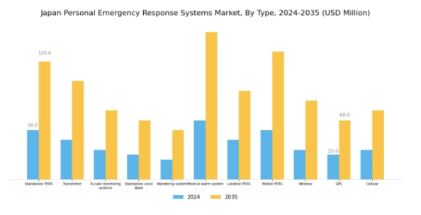 日本における高齢化社会への移行は、個人用緊急通報システム市場に大きな影響を与えています。高齢者の増加に伴い、安全と健康状態のモニタリングに特化したシステムへの需要が高まっています。