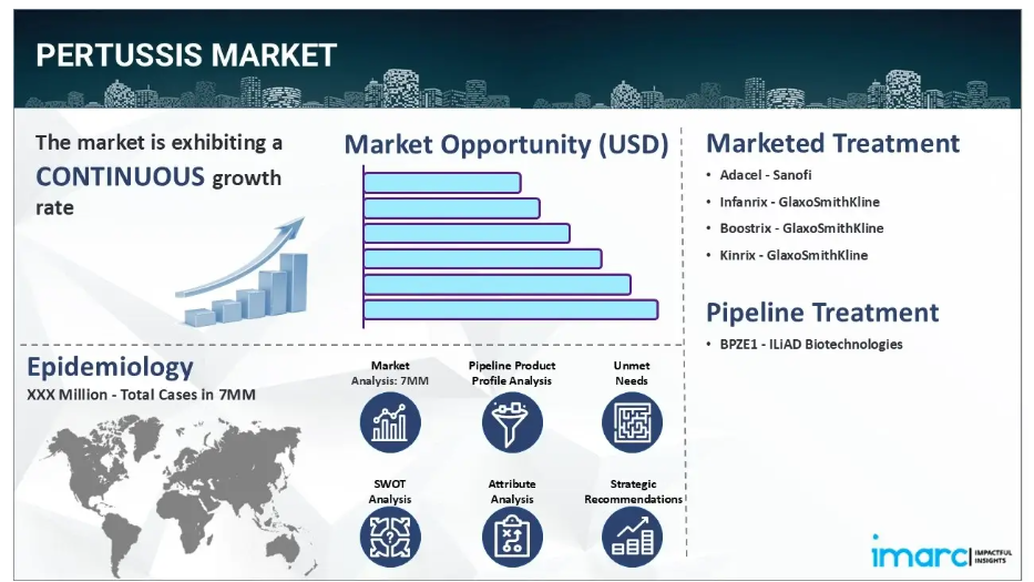 IMARC Groupの新報告書は、米国、EU4(ドイツ、スペイン、イタリア、フランス)、英国、日本における百日咳市場について包括的な分析を提供します。これには、治療実践、市場流通中および開発中の薬剤、個別療法のシェア、7大市場における市場動向、主要企業とその薬剤の市場実績などが含まれます。また、7大市場における現在および将来の患者数についても提示しています。本報告書によれば、米国は百日咳の患者数が最も多く、治療市場としても最大規模を占めています。さらに、現在の治療実践/アルゴリズム、市場推進要因、課題、機会、償還シナリオ、未充足医療ニーズなども本報告書に記載されています。本報告書は、製造業者、投資家、ビジネス戦略家、研究者、コンサルタント、および百日咳市場に関与している、あるいは参入を計画している全ての方にとって必読の資料です。