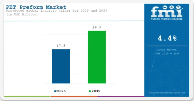 世界のPETプリフォーム市場は2025年に175億米ドルと評価され、2035年までに269億米ドルに達すると予測されており、これは年平均成長率(CAGR)4.4%を示しています。この市場は、食品・飲料、パーソナルケア、家庭用品、医薬品分野における軽量で耐久性があり、コスト効率の高い包装材への需要増加によって牽引されている。