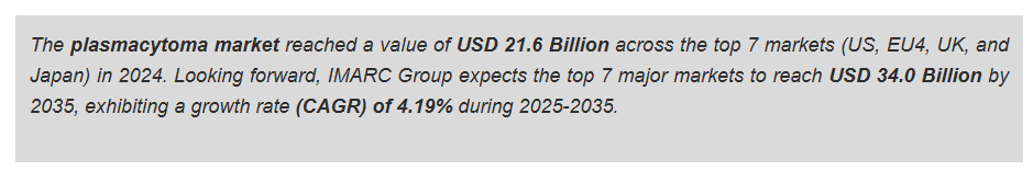 IMARC社の新報告書「形質細胞腫市場規模、疫学、市場内医薬品売上高、開発中の治療法、および地域別展望 2025-2035年」において、形質細胞腫市場が包括的に分析されました。形質細胞腫は骨髄や軟組織に発生する稀な形質細胞腫瘍であり、感染に対する身体の防御機能を損ないます。この疾患は主に骨、特に脊椎に影響を及ぼしますが、頭蓋骨、肋骨、骨盤などの他の部位にも発生する可能性があります。症状は腫瘍の大きさや位置によって異なります。この疾患に関連する一般的な疾患には、局所的な骨の痛み、骨折、腫れ、喉の渇きの増加、頻尿、疲労感などが挙げられます。形質細胞腫を患う患者様は、背部痛、筋力低下、しびれ、あるいは排便・排尿機能障害といった神経学的症状を経験される場合もあります。本疾患の診断には、患者様の臨床症状、病歴、身体検査の検討が重要です。医療従事者は、腫瘍の位置や範囲を特定し、骨や組織への影響を評価するため、コンピュータ断層撮影(CT)や磁気共鳴画像法(MRI)などの診断検査を実施することがあります。さらに、基礎疾患の特徴である異常形質細胞の存在を確認するためには生検が必要です。