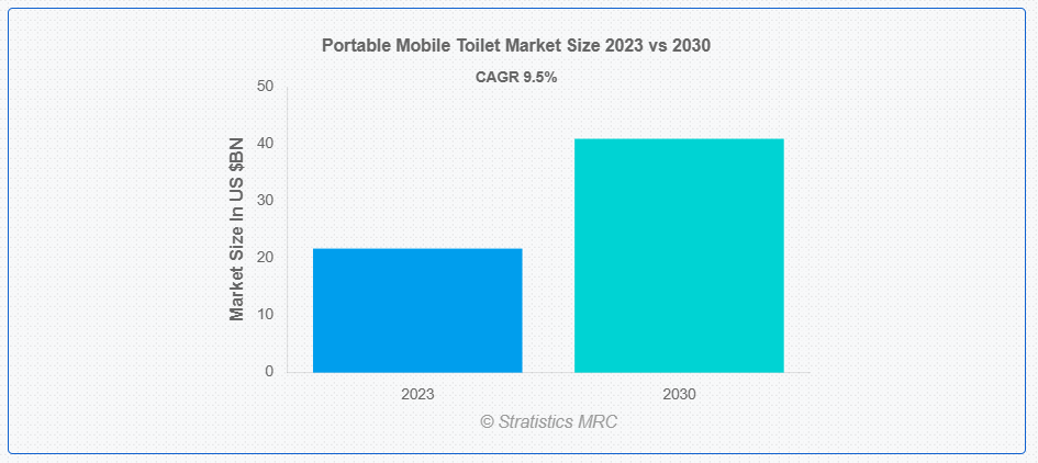 ストラティスティクスMRCによると、世界のポータブル移動式トイレ市場は2023年に217億ドル規模であり、予測期間中に年平均成長率(CAGR)9.5%で成長し、2030年までに409億ドルに達すると見込まれている。携帯式移動トイレは、恒久的なトイレが利用できない、または設置が困難な様々な環境において、一時的なトイレ設備を提供するよう設計された自立型で運搬可能な衛生施設である。携帯式移動トイレには、廃棄物の分解と臭気抑制を助ける化学的または生物学的処理装置が装備されている。これらのユニットは、特に従来のトイレ施設へのアクセスが制限されている状況において、公衆衛生と衛生の促進に重要な役割を果たしている。